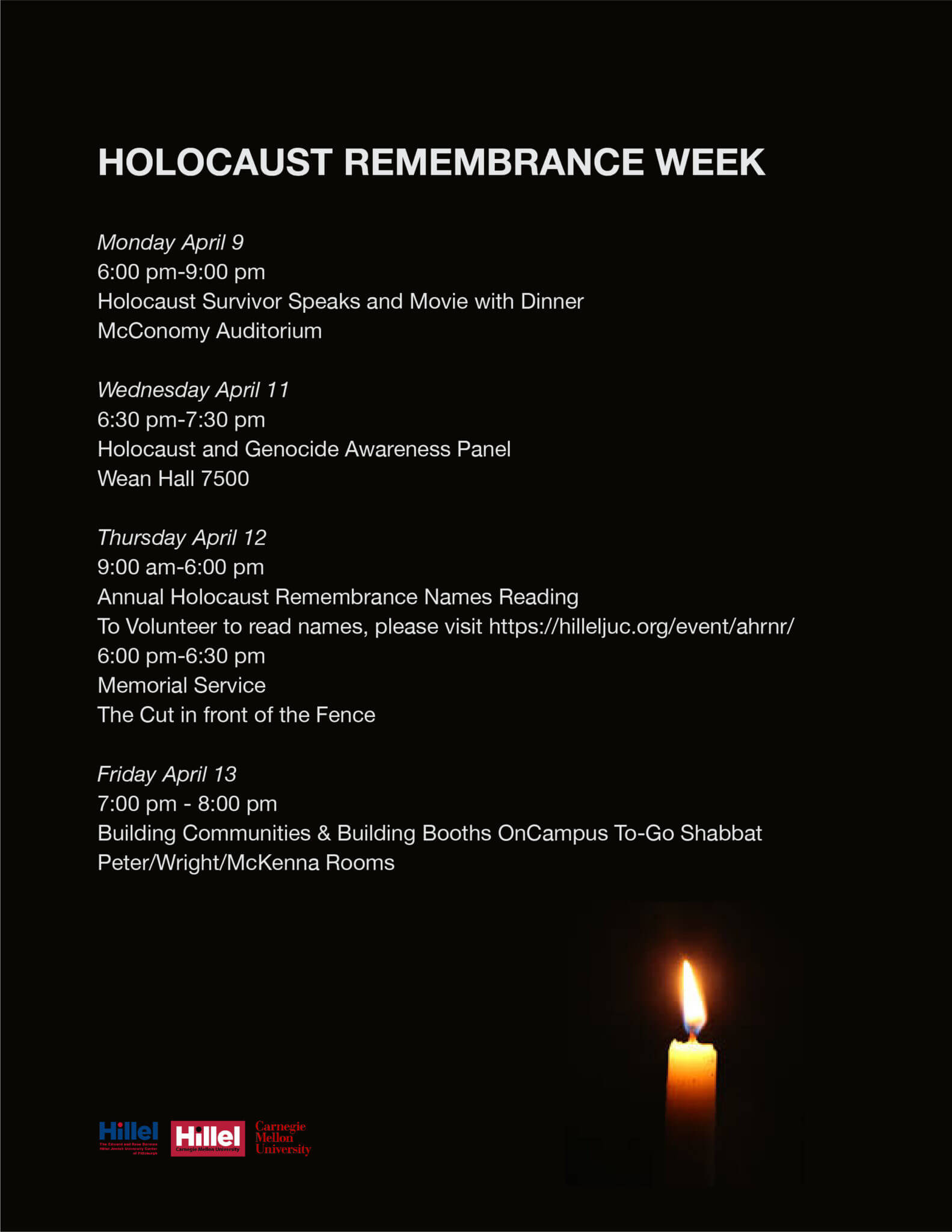 The Annual CMU Holocaust Remembrance Names Reading will be held this year on April 12th, 2018, from 9 am to 6 pm. A Memorial Service will follow starting at 6 pm.
