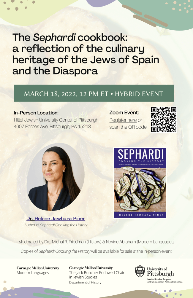 All Pitt and CMU students are invited to join Dr. Helene Jawhara Piner, author of Sephardi Cooking the History for a lecture at Hillel JUC this Friday!